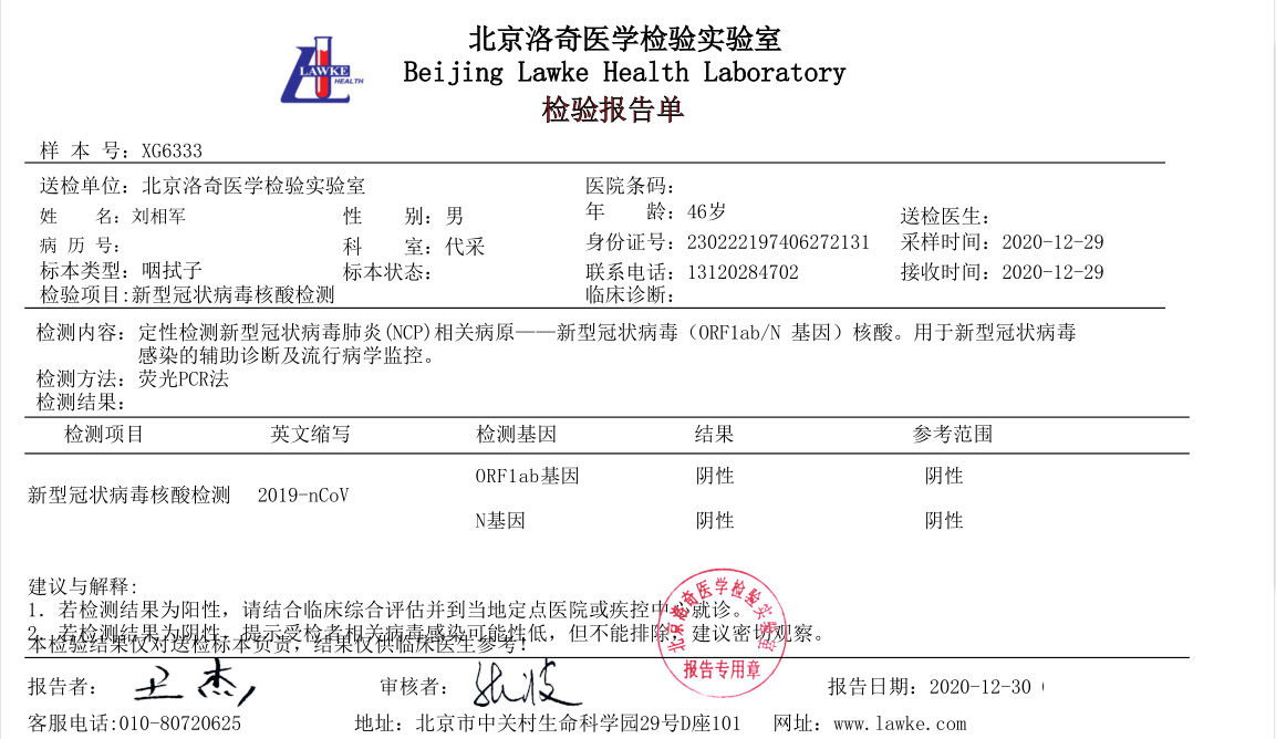 ? ? ? ?目前隨著國內(nèi)部分地區(qū)新型冠狀病毒的零星出現(xiàn),對人們心理上增加了許多恐慌,京朝軒餐飲為了安全起見,對食堂在職員工集體統(tǒng)一做了核酸檢測,下面是部分人員核酸檢測報告證明: