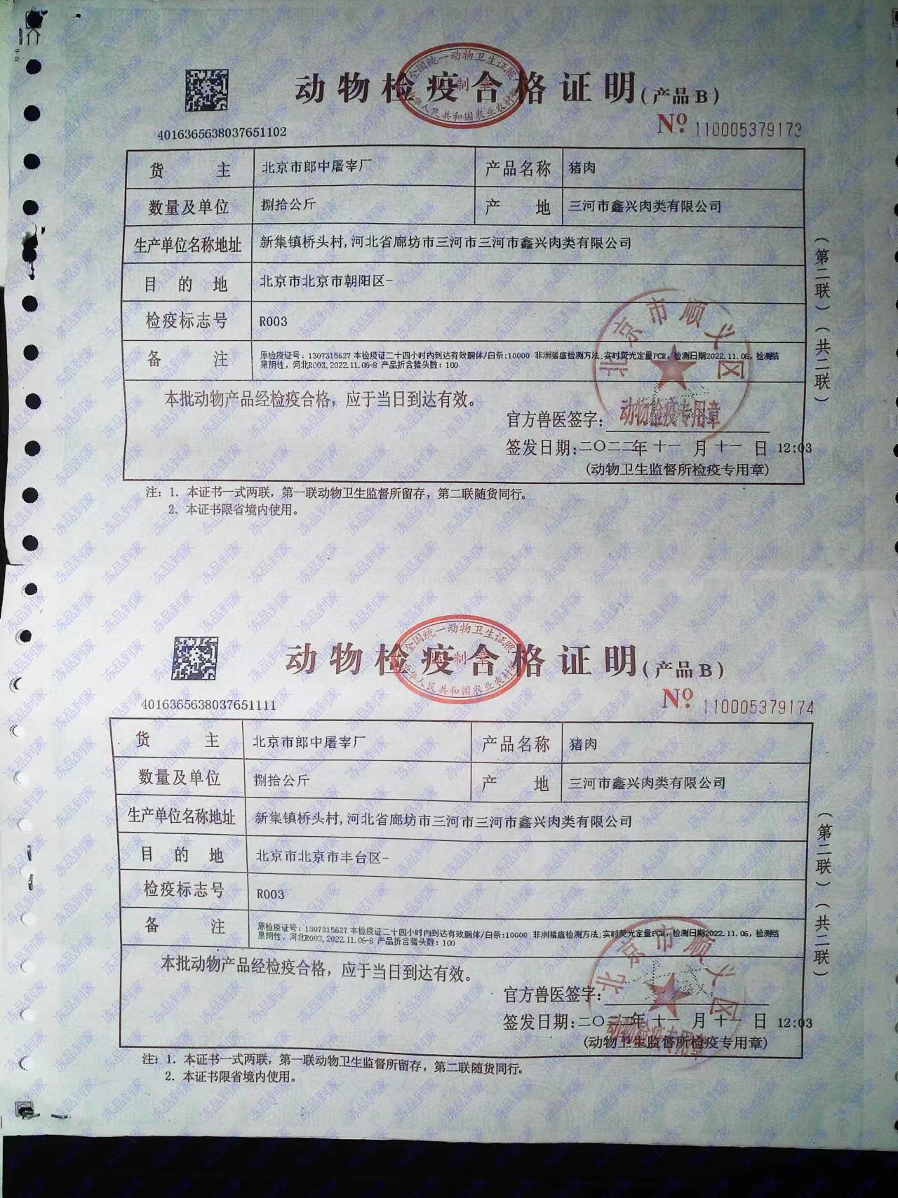 京朝軒食堂承包豬肉類采購動物檢疫合格證明