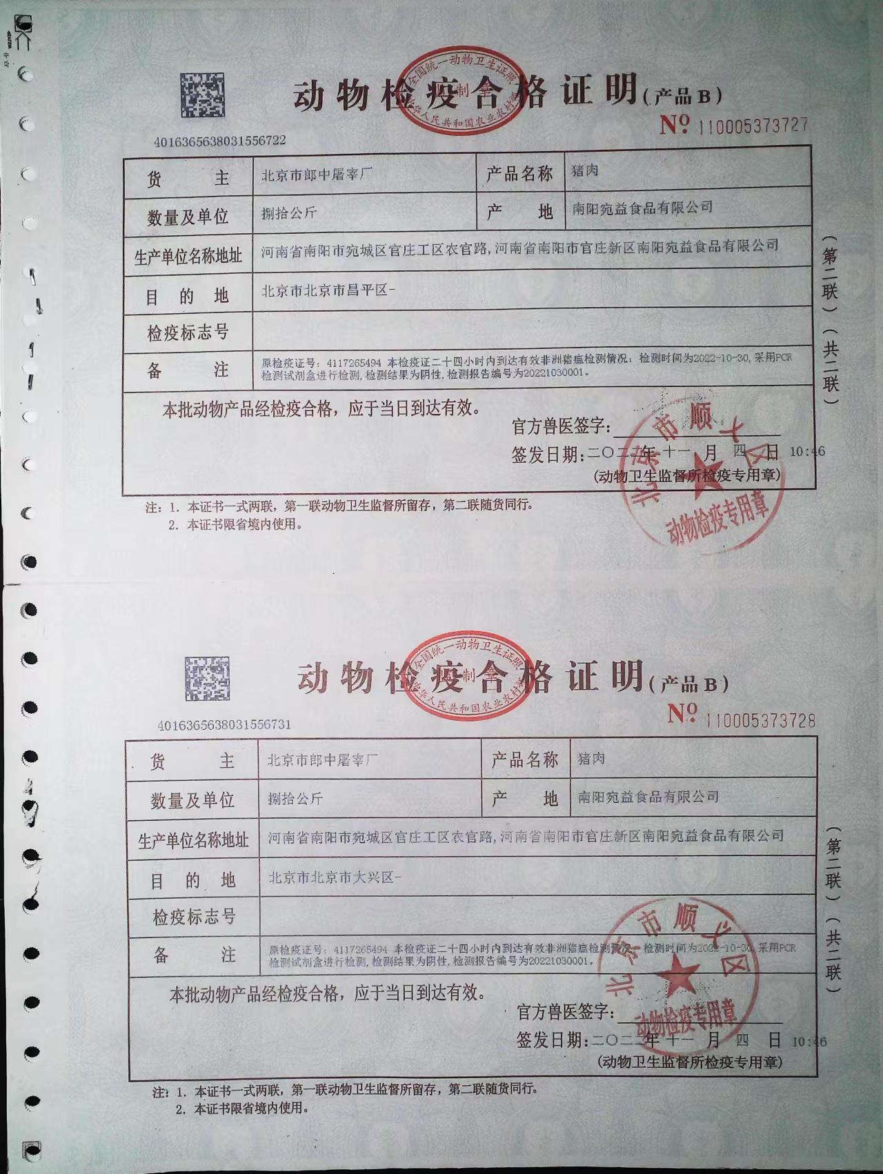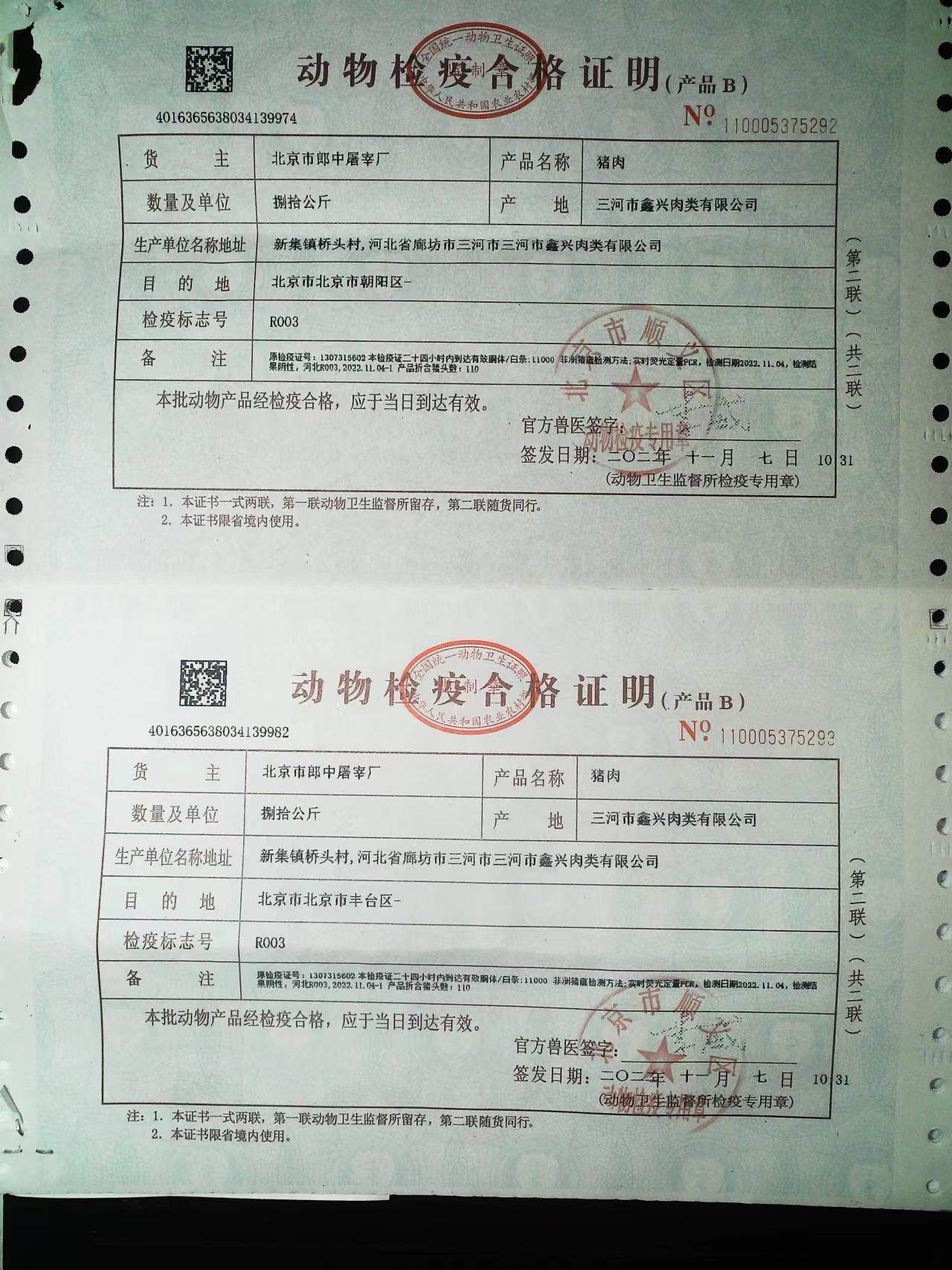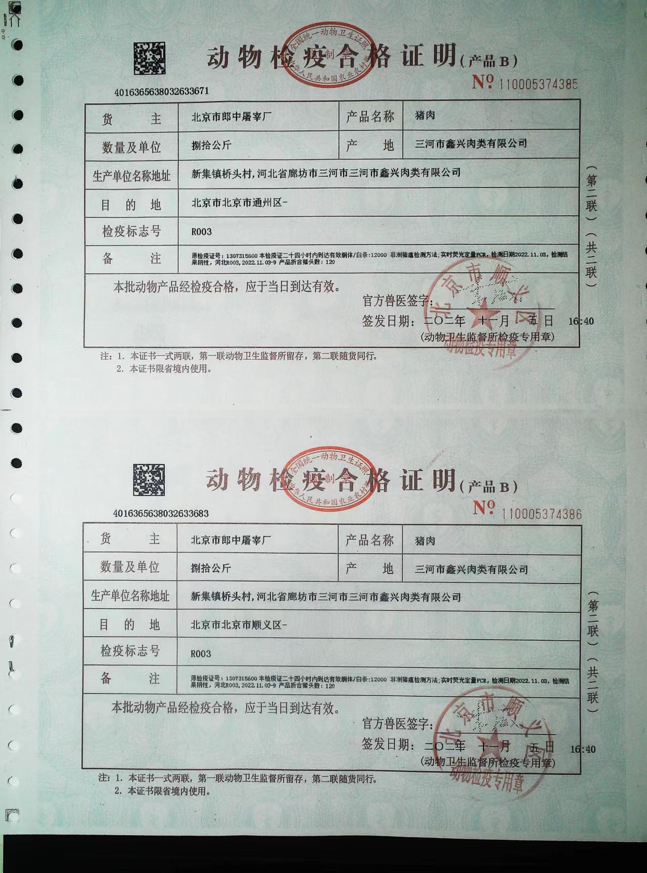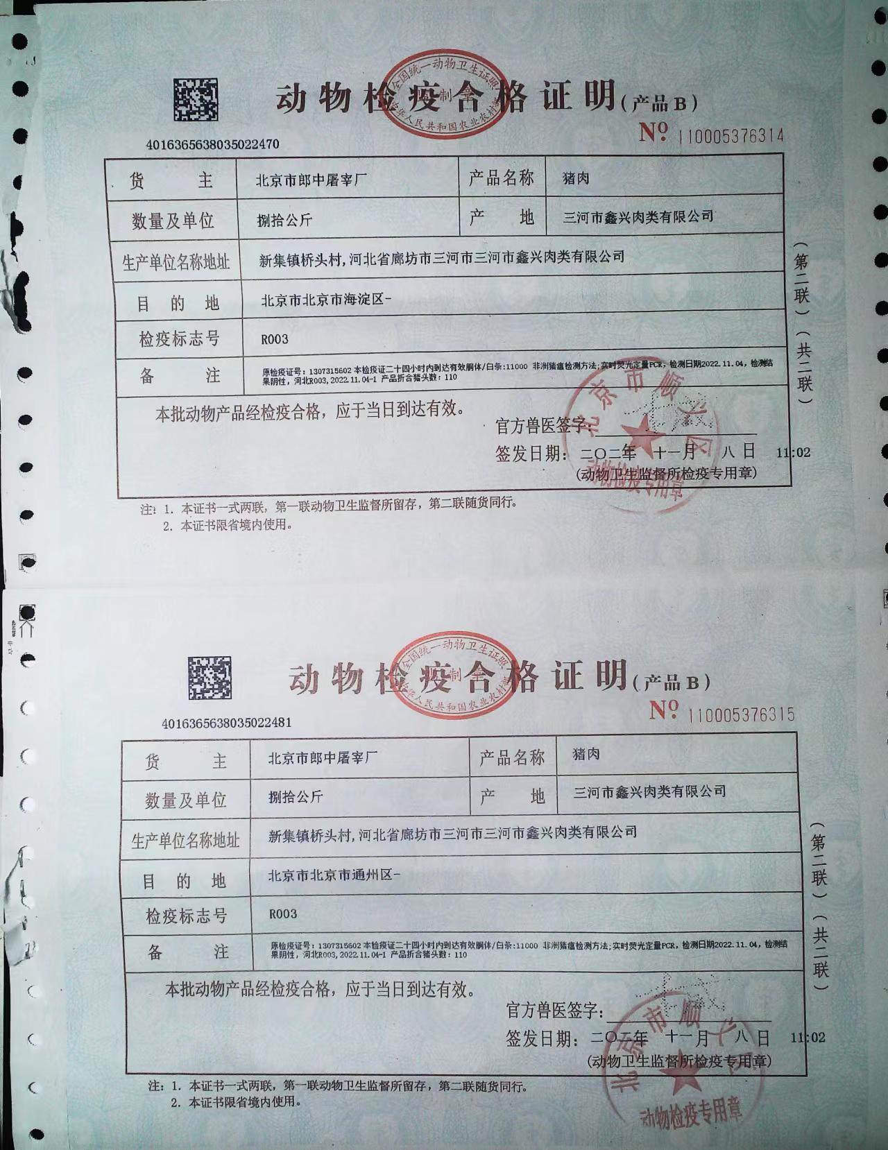 ? ? ? 新冠疫情當(dāng)下京朝軒食堂承包管理制度嚴(yán)格執(zhí)行,食堂工作人員核酸檢測保證每日一檢,不僅對本公司員工負(fù)責(zé),而且也對客戶的員工用餐負(fù)責(zé),采購方面也加強(qiáng)管理,嚴(yán)格監(jiān)控索證制度,禁止不合格的肉類、米面、糧油、調(diào)料等進(jìn)入食堂,下面是京朝軒食堂采購豬肉類動物檢疫合格證明: