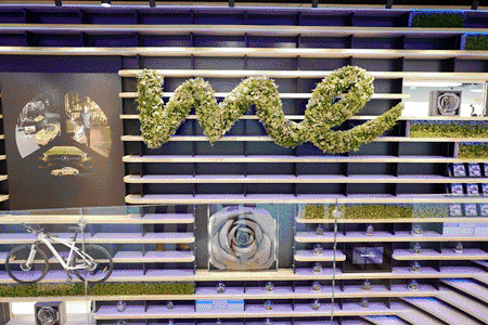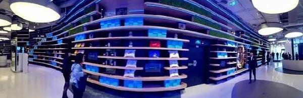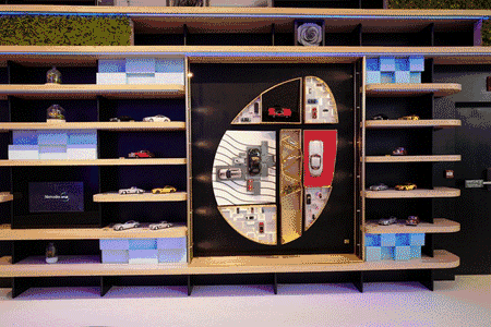 ▽ 進(jìn)門口可以看到長長的商品展示架,展示各種商品,這是奔馳周邊產(chǎn)品的展示。