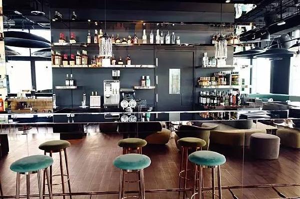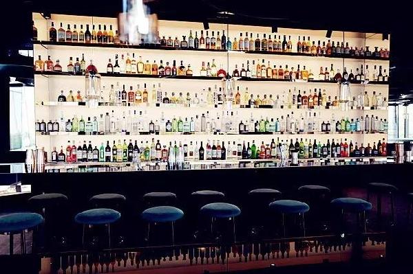 二層的酒吧區(qū),舒適的環(huán)境,高端的設(shè)計。鏡面的吧臺,透過鏡子看到就餐區(qū)的影子,使空間看起來更加寬闊。吧臺后方的架子上擺滿了各式各樣的酒水,明亮的架子上造型顏色各異的酒瓶看起來非常好看。