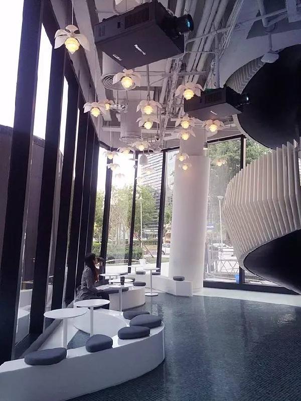 一層還設(shè)計了咖啡簡餐就餐區(qū),設(shè)計簡潔,但是天花的設(shè)計卻很有特色,如花一樣的燈飾把簡單的餐廳妝點得更加好看。
