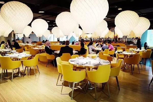 而二樓則是餐廳和酒吧,這就是餐廳區(qū)域,亮黃色的桌椅顯得特別活潑。