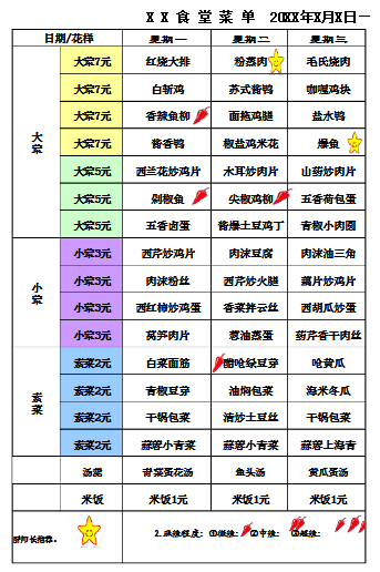 ?常見的營養(yǎng):A、碳水化合物----谷類、薯類等 B、脂肪----烹調(diào)用油及食物本身 C、蛋白質(zhì)----肉、魚、蛋、奶、豆及谷類 D、礦物質(zhì)----紅肉類、動物血、肝臟、牛奶、豆制品、綠葉蔬菜等 E、維生素----動物肝臟、魚類、蛋類、肉類、谷類及蔬菜水果 F、水----飲水和各種食物白開水為主的飲水原則 。? 食譜的樣板: